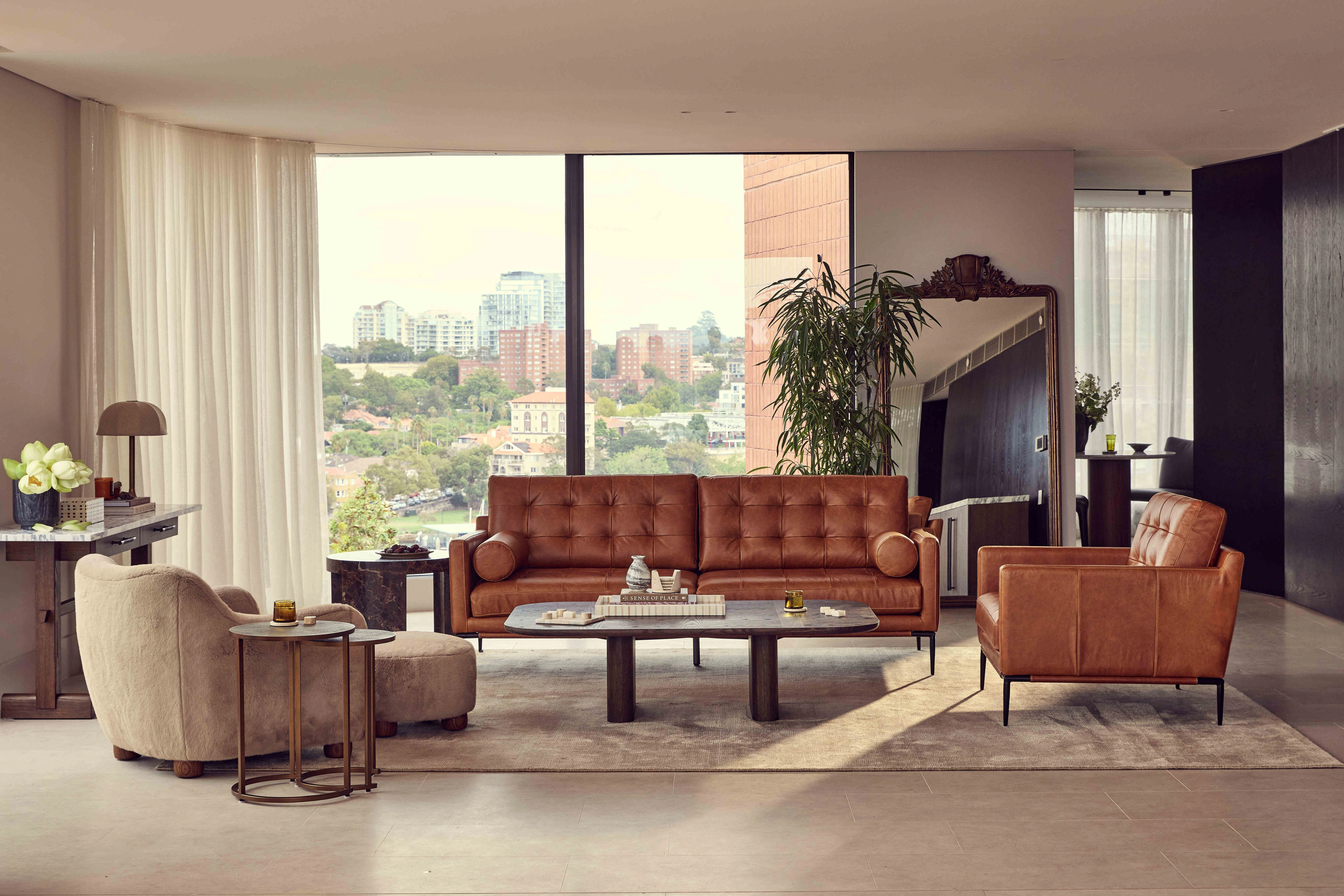 Drawing on the refined modernism of Florence Knoll, the Pembroke pairs a clean architectural silhouette with tailored button tufting and leather upholstery. Knock-down legs make it ideally suited to apartments and compact spaces, without compromising mid-century elegance.
