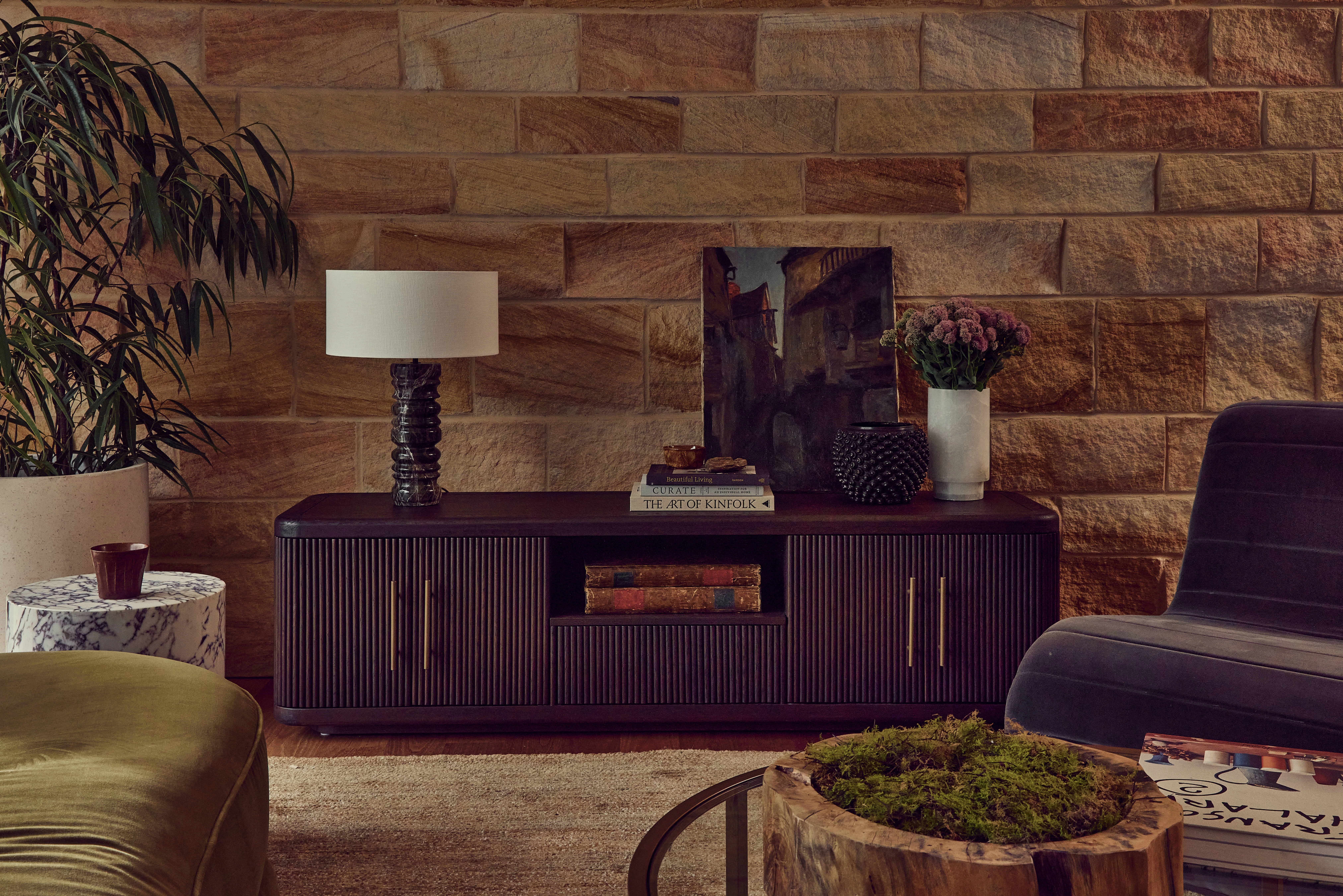 Understated elegance for the living space, defined by distinctive reeded detailing and refined functionality. Crafted from solid oak, its construction offers strength and longevity while celebrating the natural beauty of the timber. Push-open drawers create a seamless finish, while integrated cable management keeps spaces beautifully resolved.