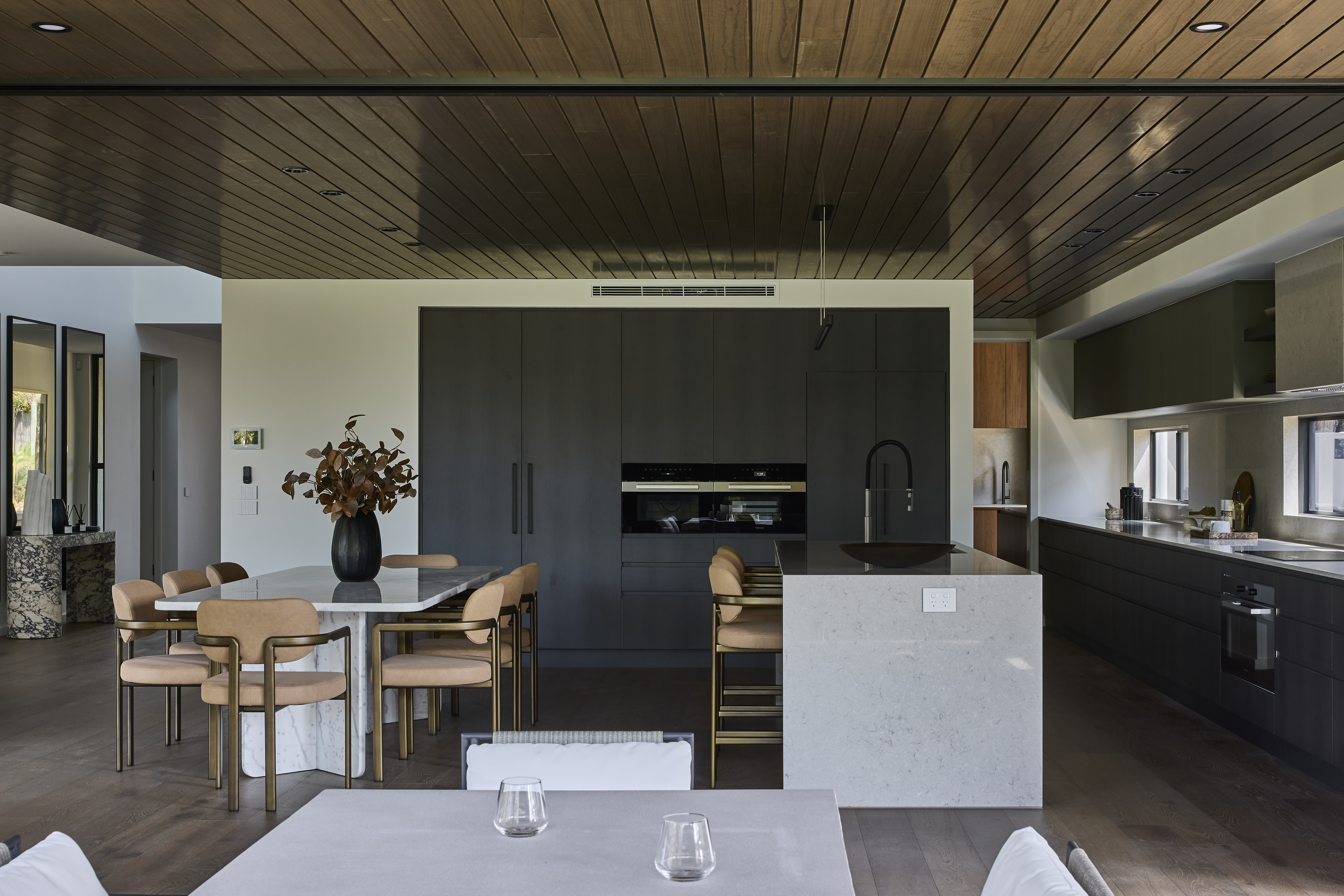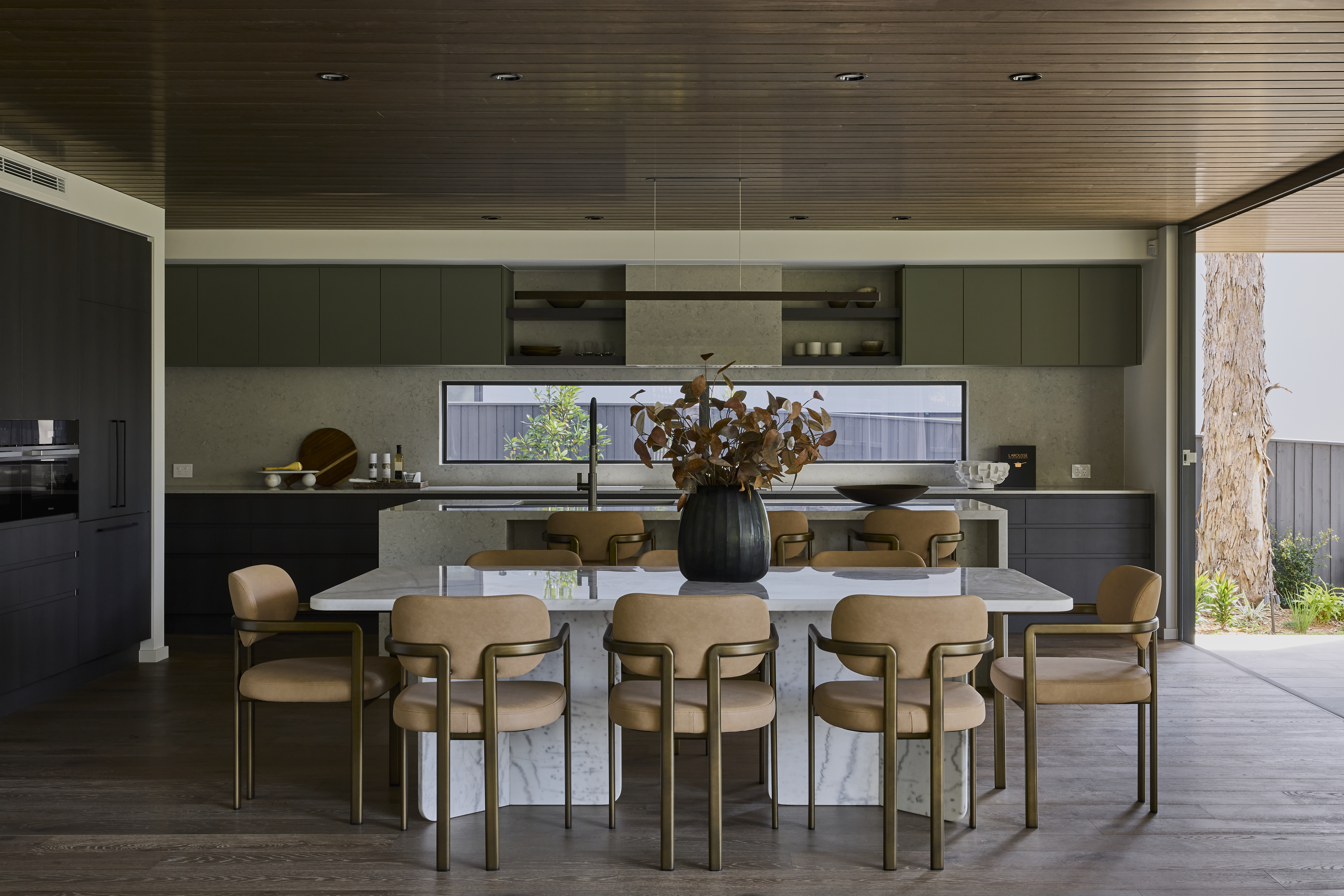At the centre of SHAWOOD’s open-plan layout lies the kitchen, a masterclass in contemporary design and timeless materiality. The Coco Republic team introduced a soft yet sophisticated furnishing palette to pair with the deep brown contemporary cabinetry with eucalyptus green accents and honed stone benchtops.