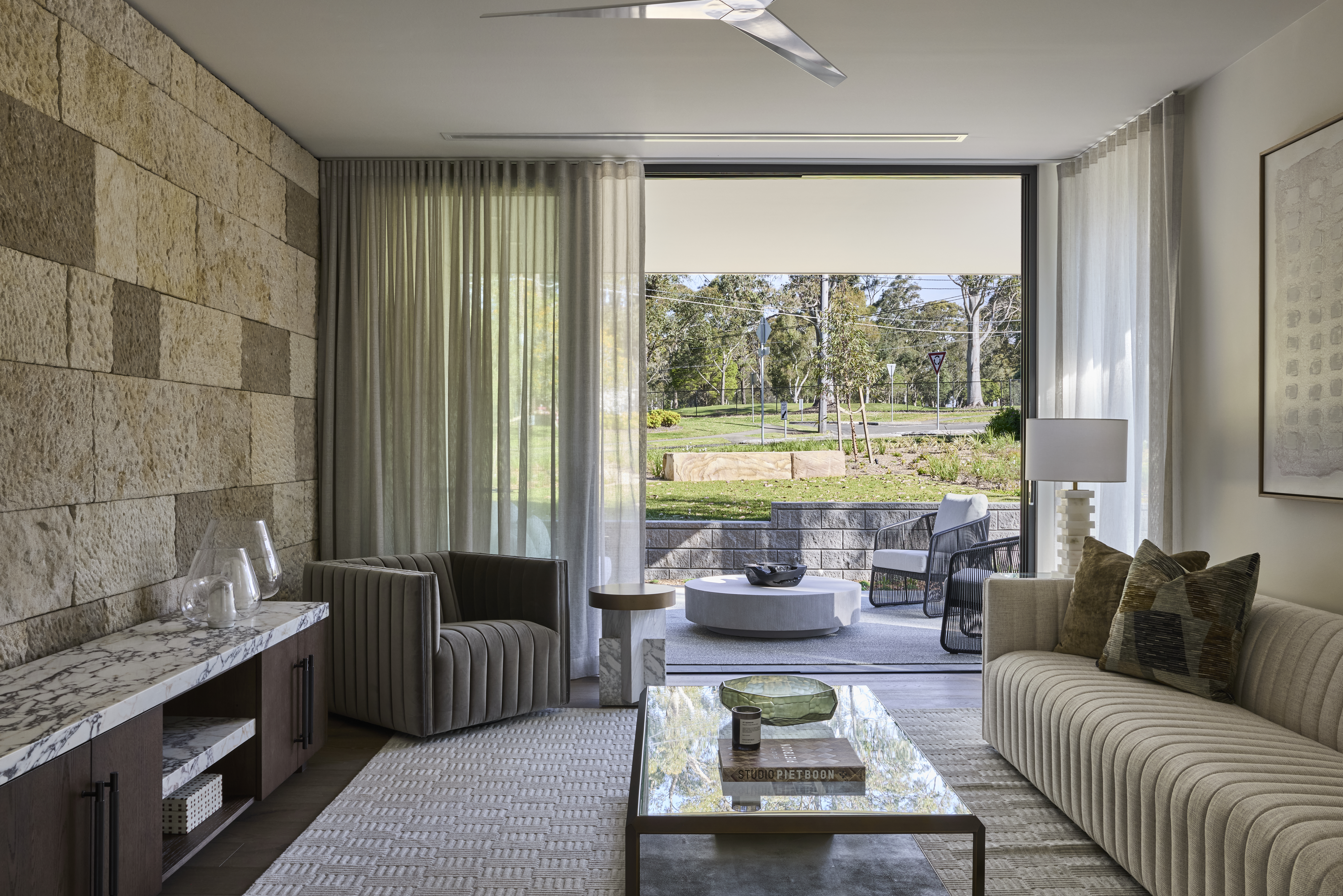 Open, serene and intuitively functional, the design embraces a harmonious palette of organic materials: warm timbers, rich sandstone and softly veined marble. Natural linens and tactile upholstery enhance SHAWOOD’s vision of long-life homes that nurture comfort, wellness and calm. Inspired by the surrounding bushland, a tonal colour palette introduces muted greens, earthy neutrals and brushed metallics, layering warmth and depth throughout the home.
