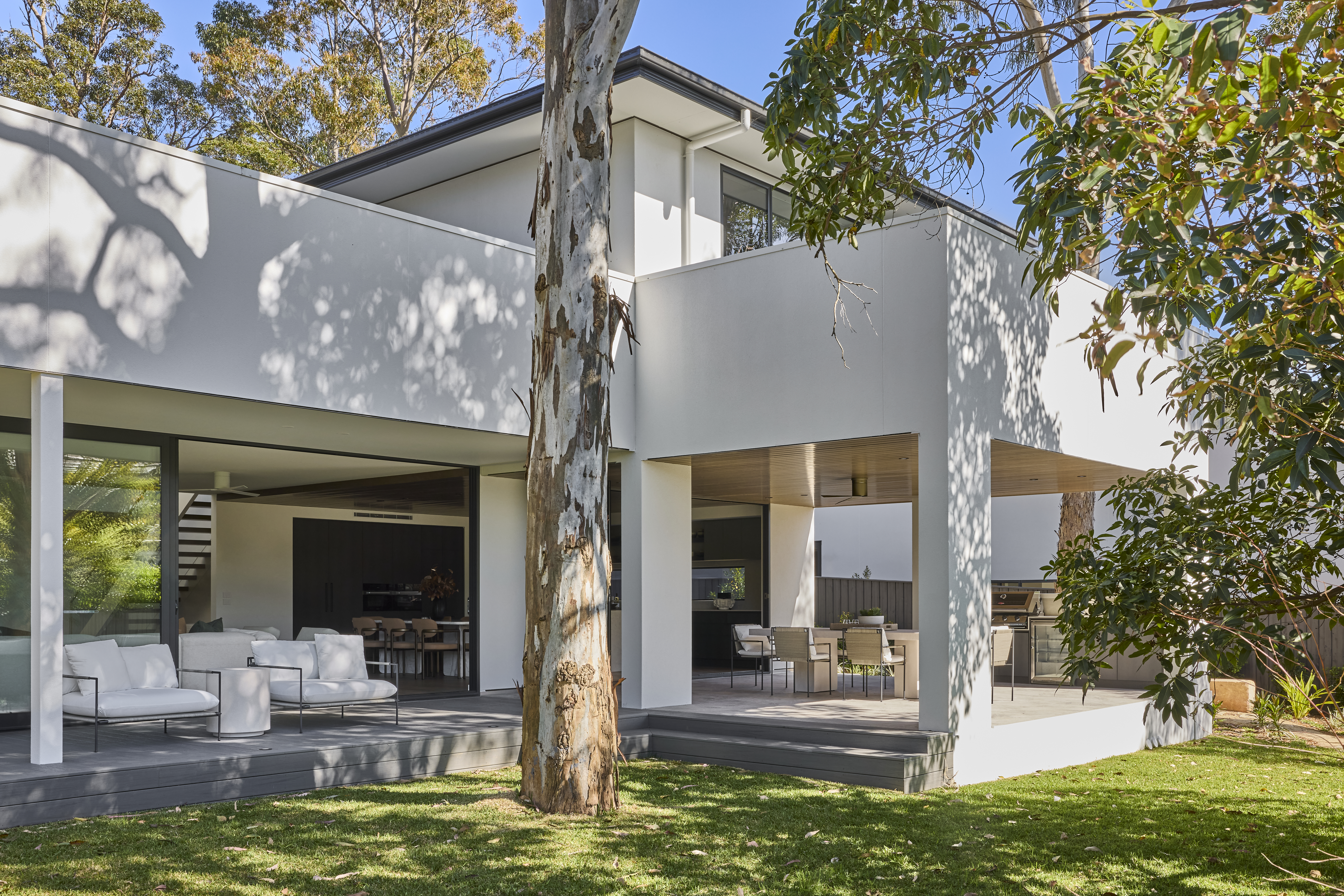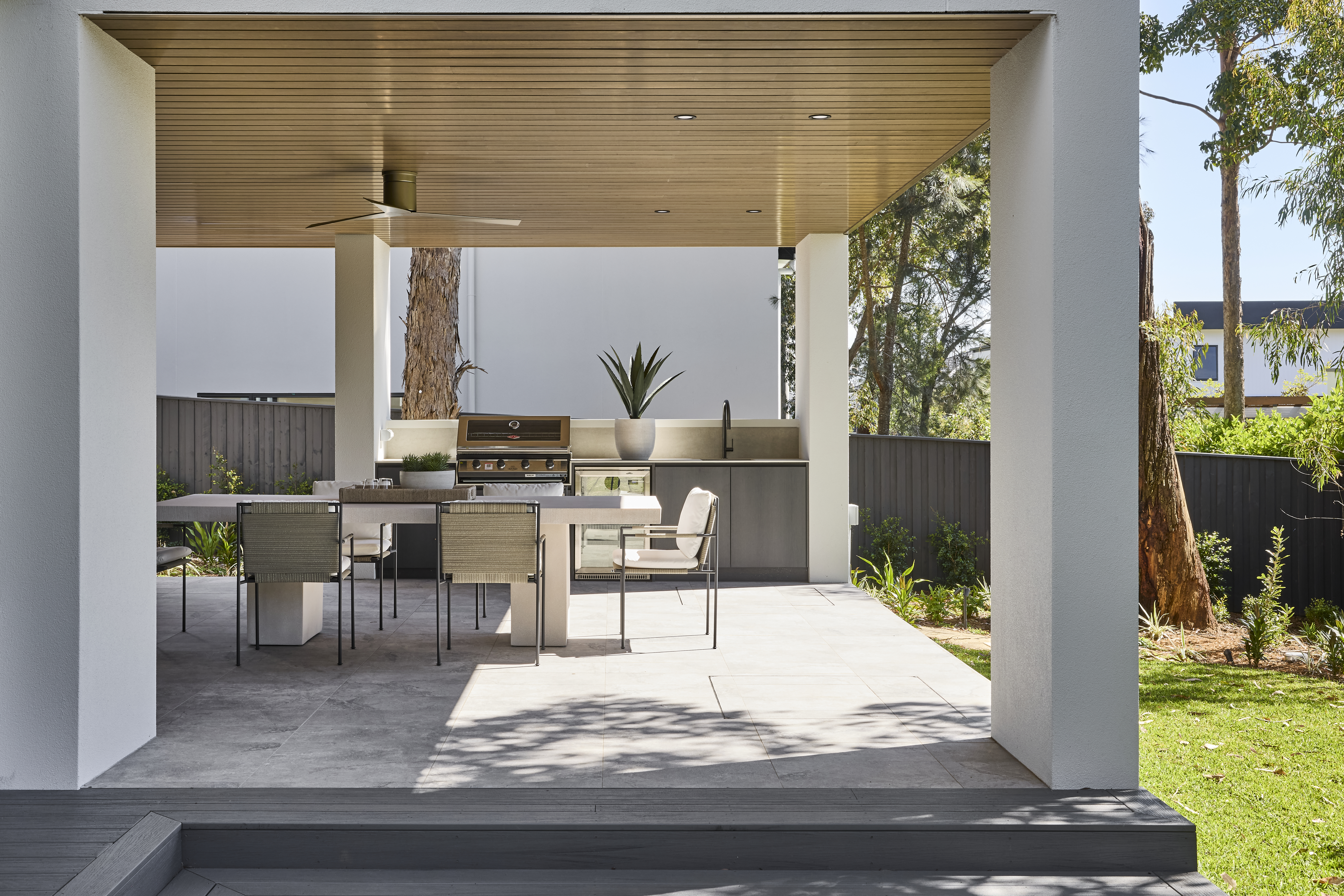 Extending beyond the main living zone, the outdoor entertaining area embodies the Australian lifestyle at its best. Under the warmth of the extended timber-lined ceiling, a fully equipped kitchen and dining space offer the perfect setting for gatherings year-round. Our Tura Carved Stone Rectangle Dining Table is the perfect centrepiece, surrounded by the Malmo Outdoor Dining Chair – a made-to-last design that blends Scandinavian minimalism with Japanese craftsmanship. The design blurs seamlessly into the surrounding garden, with natural textures and clean lines creating continuity between the home’s architecture and landscape.