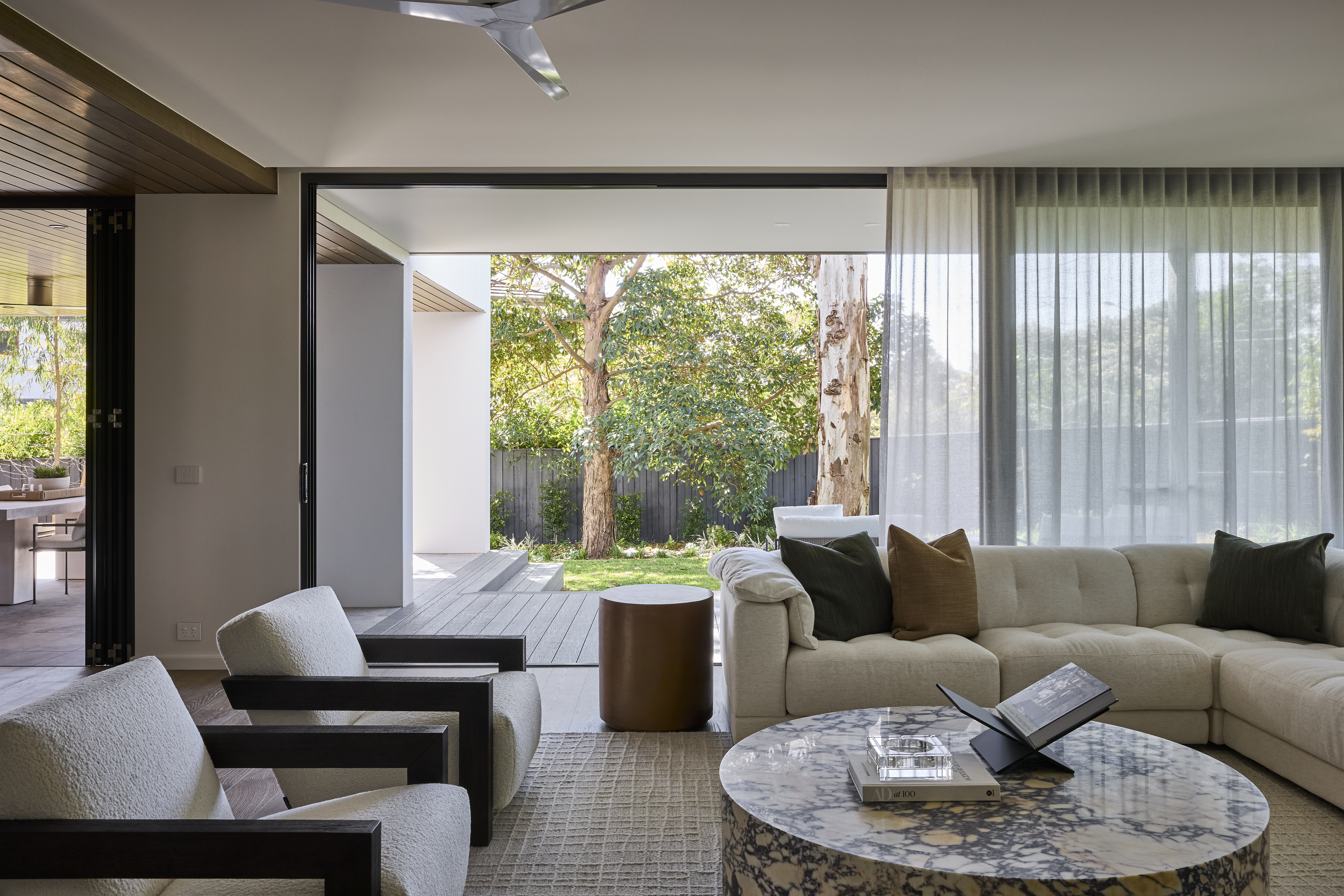 Layers of soft furnishings and muted metallic accents, such as the Zali Side Table, create visual interest without overpowering the room’s calm aesthetic. The expansive glass doors blur the boundaries between indoors and out, allowing dappled light to filter through and offering uninterrupted views of the surrounding greenery.