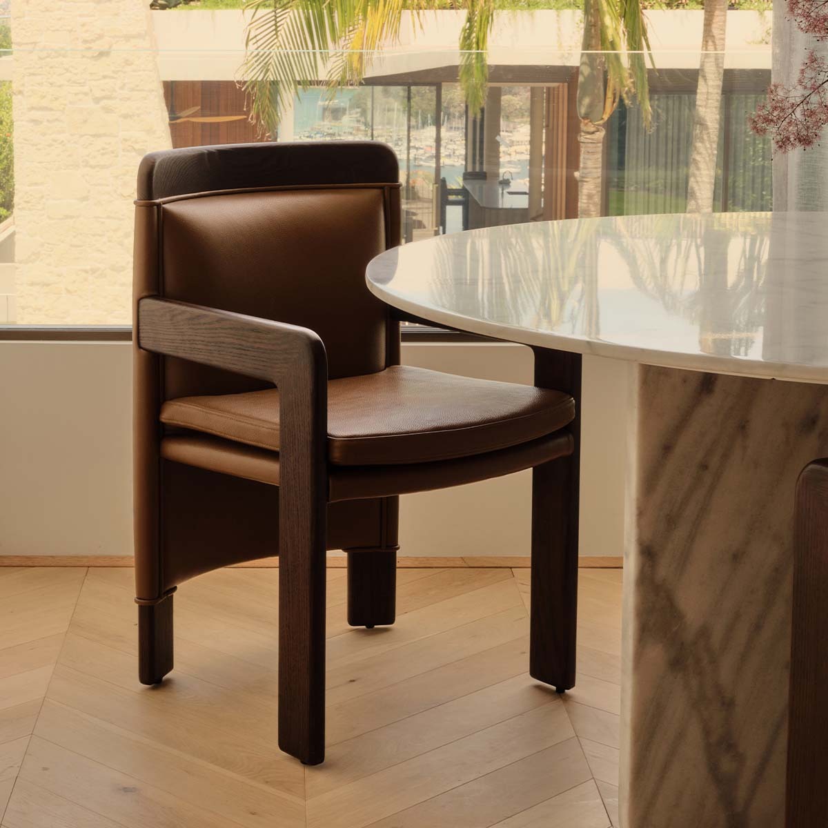 A statement walnut table inspired by geological formations, the Steppe anchors the dining space with natural warmth and rounded elegance.