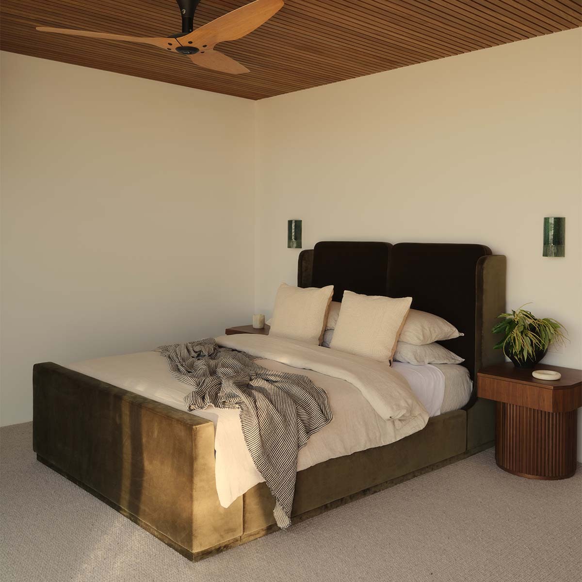 Inspired by the curves of 1940s sleigh beds, the Halcyon Bed pairs a graceful upholstered silhouette in Avignon Velvet Olive with a robust timber frame, creating a calming centrepiece for the bedroom.